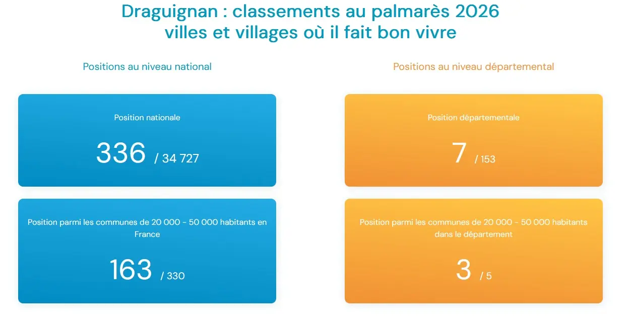 La ville de Draguignan, déjà très bien classée en 2025 progresse au palmarès en décrochant la 336ème place sur 34727 communes au niveau national et à la 7ème place sur 153 au niveau départemental.